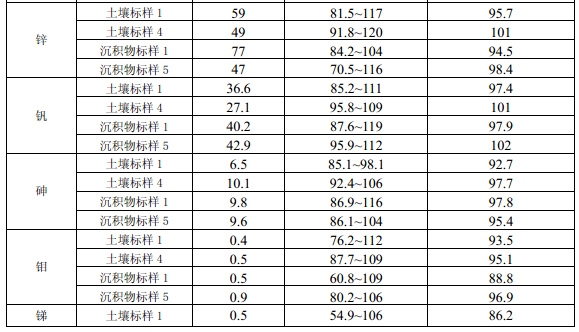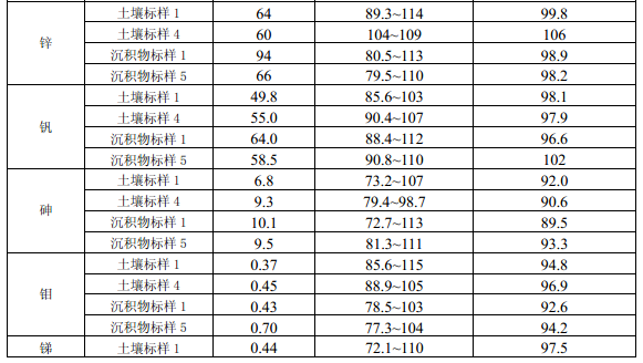 11.4 每批次樣品至少分析 10% 的加標回收樣,樣品數量小于 10 個時,應至少做一個加標 回收樣。加標回收樣測定結果中,電熱板消解測定鎘(Cd)、鈷(Co)、銅(Cu)、鉻(Cr)、 錳(Mn)、鎳(Ni )、鉛(Pb)、鋅(Zn)、釩(V)、砷(As)的加標回收率應控制在 70% ~ 125%之間,鉬(Mo)、銻(Sb)的加標回收率應控制在 50% ~125%之間;微波消解測定 12 種金屬元素的加標回收率應控制在70% ~125%之間。