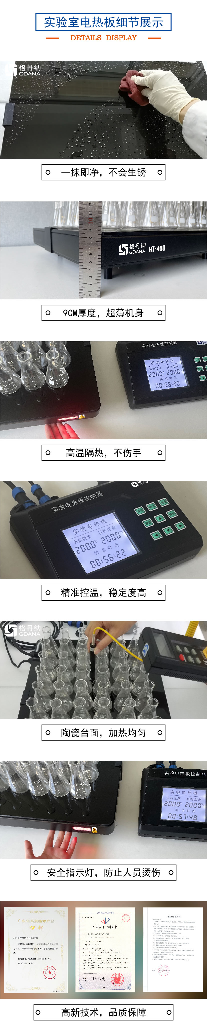 HT-400陶瓷加熱板專用于無機化學(xué)元素分析時對各類樣品作加熱、消煮、趕酸用的恒溫加熱裝置。臺面具有耐酸堿,不生銹等特性;分體PID程序數(shù)顯控溫,是實驗室樣品預(yù)處理好助手。