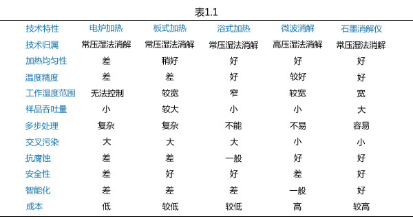 石墨消解儀與其它消解設(shè)備的特性對比如表1.1