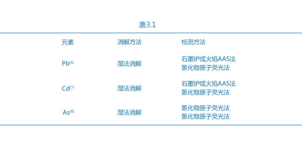在食品進(jìn)出口中,重金屬是必檢項目,其消解方法和檢測方法見表3.1。