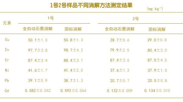 準(zhǔn)確稱(chēng)取采集的樣品l號(hào)和2號(hào)樣品,分別使用全自動(dòng)石墨消解法和國(guó)標(biāo)推薦法對(duì)樣品進(jìn)行消解處理,每個(gè)樣品每個(gè)方法分別消解6個(gè),統(tǒng)一測(cè)定消解液中6種重金屬元素的含量測(cè)定結(jié)果如下表。由表中可知,全自動(dòng)石墨消解法和國(guó)標(biāo)推薦方法的測(cè)定值基本趨于一致。