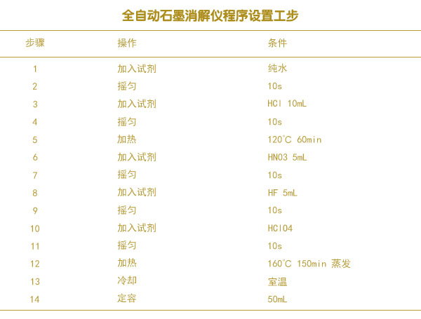 由于測(cè)定Cu,Zn,Pb,Cd,Cr,Ni等6種重金屬采用統(tǒng)一的消解液,本次試驗(yàn)使用HCl—HNO3一HF—HClO4混合酸消解體系,將土壤中的晶格全部打開(kāi),進(jìn)行全消解。因用酸量較少,只需準(zhǔn)確稱(chēng)取0.2000g左右干燥土壤樣品至消解管中,設(shè)置系統(tǒng)自動(dòng)加酸。就可進(jìn)行消解。全自動(dòng)石墨消解系統(tǒng)的消解程序設(shè)置如下表格。儀器自動(dòng)定容至50mL,每批樣品加做雙份全程序空白。