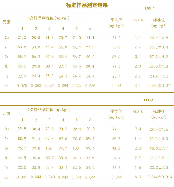 分別準(zhǔn)確稱(chēng)取ESS一1和ESS一3標(biāo)準(zhǔn)土壤樣品各6份,標(biāo)準(zhǔn)樣品轉(zhuǎn)移至石墨消解儀樣品管中,放進(jìn)相應(yīng)的樣品位置,統(tǒng)一測(cè)定消解液中6種重金屬元素的含量,測(cè)定結(jié)果如上面的表格。結(jié)果得出2個(gè)土壤標(biāo)準(zhǔn)樣品中的6種重金屬元素測(cè)定值均在不確定度范圍內(nèi),且相對(duì)標(biāo)準(zhǔn)偏差均小于7%。