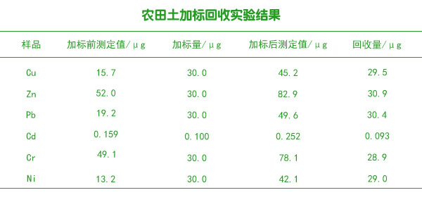 同時對農田土進行加標實驗,平行加標3份,加標回收率進行測定,結果如下表。