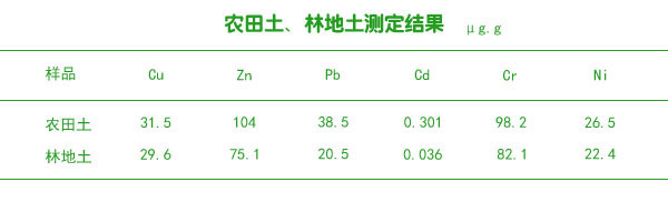 采用全自動消解方法對農地土壤、林地土壤進行消解分析,每個樣品平行測定3份,測定數據見下面表格。從表可以看出實驗結果滿意。