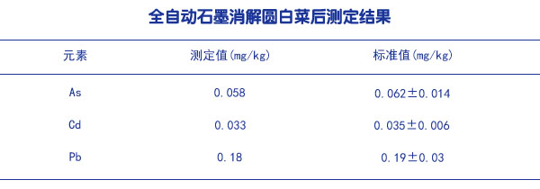 采用全自動石墨消解儀消解完后,在優化的測試條件下對每份試樣溶液平行測定2次,取2次測定的平均值作為測試結果,并與標準物質的含量進行比較(見表:全自動石墨消解圓白菜后測定結果)。從測試結果可以看出圓白菜標準物質As、Cd、Pb的含量均在隹直的范圍內。說明全自動化消解儀對蔬菜的消解方式效果很好。