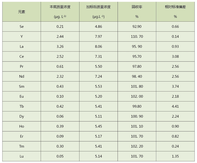 從表中可以看出,使用該方法消解茶葉測定其中的稀土含量,具有很好的回收率和精密度,加標回收率和精密度(RSD)分別為92.9%~110.7%和0.24%~4.41%,實驗結果滿足要求,該方法可靠,同時適用于其它植物類的應用。