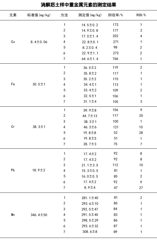 討論:不同類型的土壤中重金屬含量有較大差異,不同消解方法對重金屬含量分析的影響也有差異。文中選用的7種消解方法對標準土樣Cu、Fe、Mn、Pb、Cr含量的測定值顯示,只有Fe、Mn含量的測定值在標準值范圍內,Cu含量在HCIO4蒸干的條件下測定值不在標準范圍內,Pb含量在HNO3蒸干、HF蒸干、HClO4蒸干以及HNO3、HClO4同時蒸干、HNO3、HF、HClO4同時蒸干的條件下測定值不在標準范圍內,Cr含量在只有HClO4蒸干的條件下測定值在標準值范圍內。