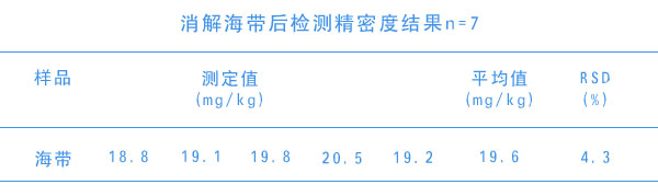 選擇低(19.6mg/kg)、中(38.5mg/kg)、高(66.8mg/kg)3個濃度水平的食用海帶樣品進行精密度試驗,考察方法重現性,3個濃度水平的RSD均<5.0%,結果見表。